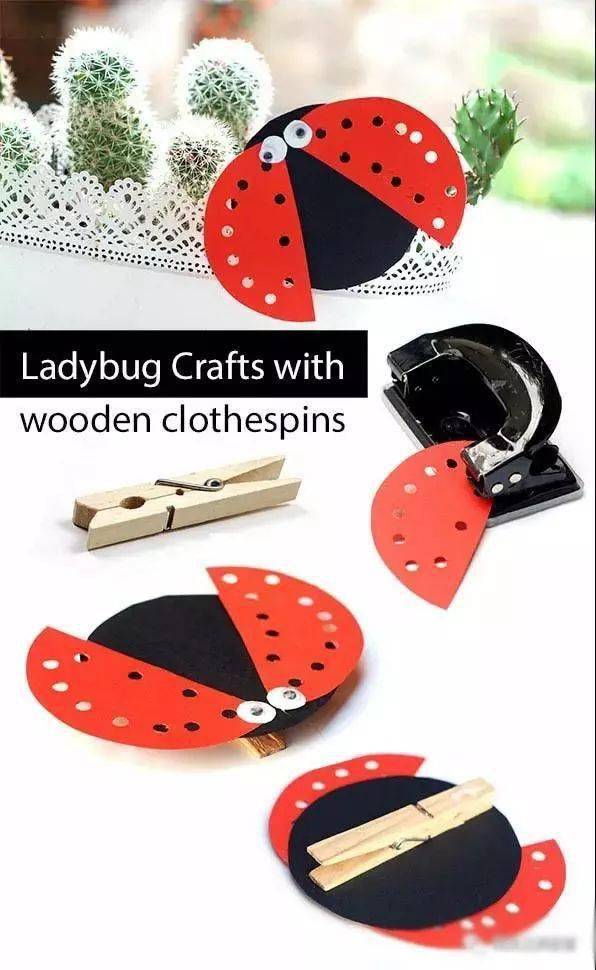 制作步骤:先分别剪出红色、黑的的圆形,再将红色剪成两个相等的半圆,并用打孔器打孔,最后把他们粘贴到晾衣夹上,并装饰上眼睛就完成啦~